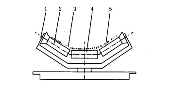 1-旋轉架 2-左曲線盤和左托輥 3-輸送帶 4-中托輥 5-右曲線盤和右托輥